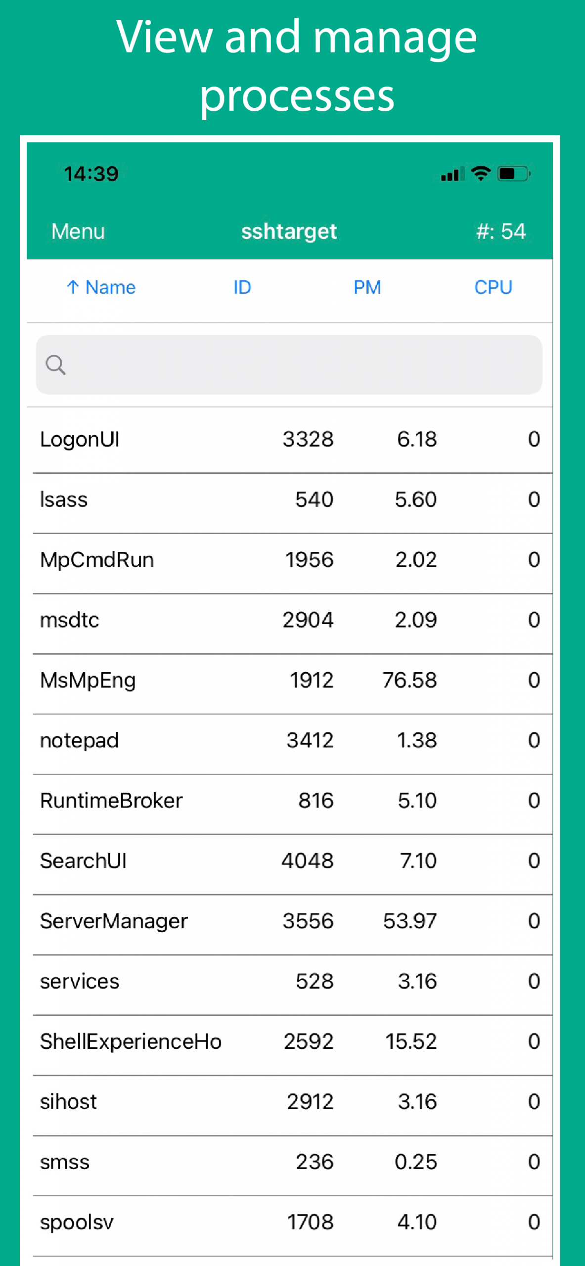 Allows you to view processes and their resource utilization on Windows servers. You can select and manage processes, including the ability to stop them.