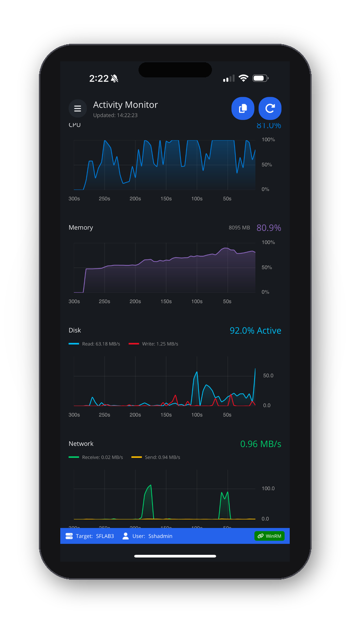 - Activity dashboard — See health at a glance without Task Manager or RDP.