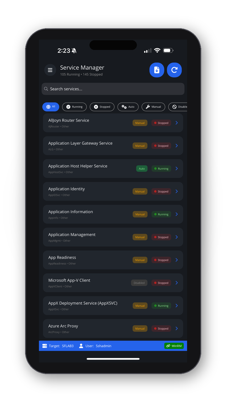 - Service manager — Check and control critical services without a console.