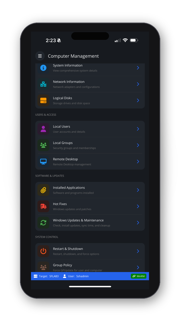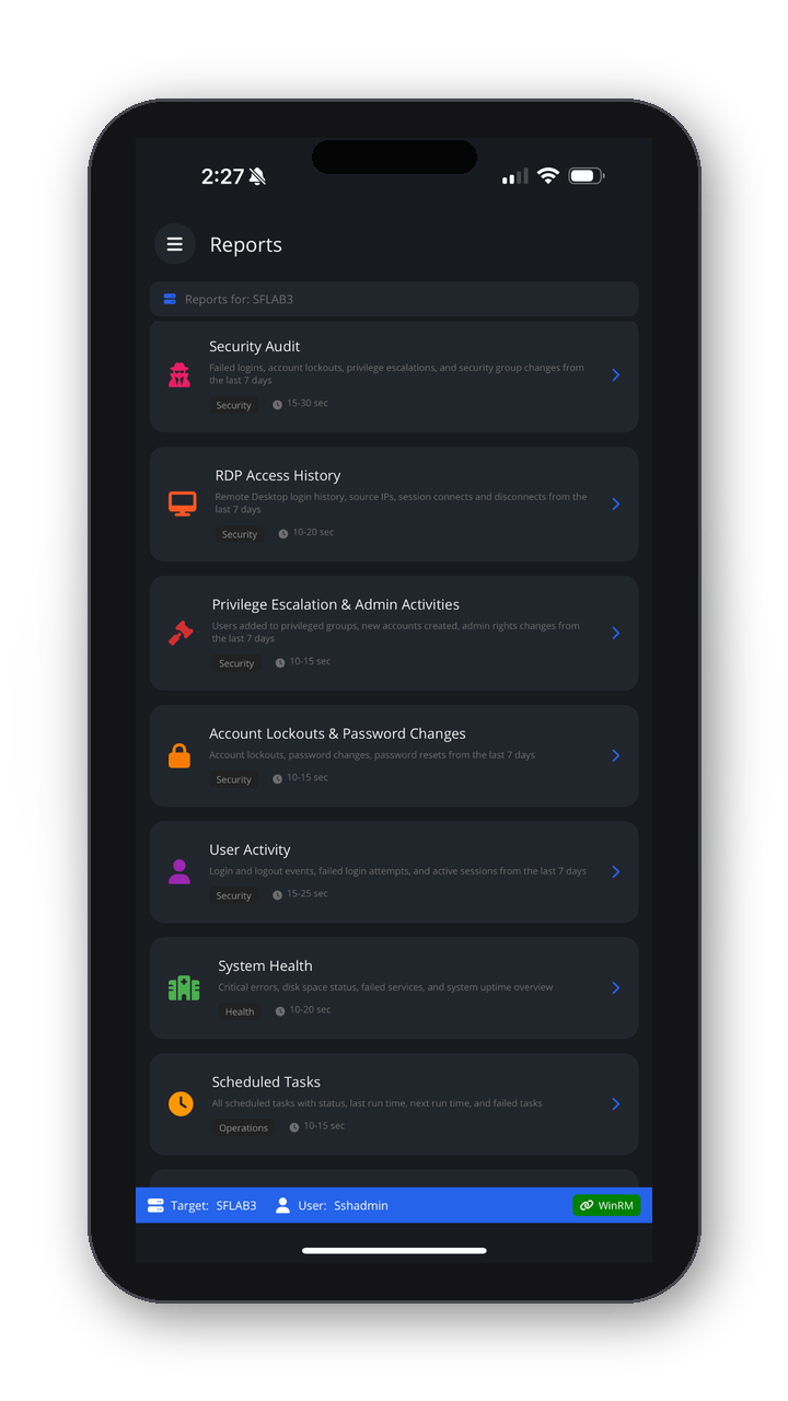 “Event logs and process monitoring on the go—exactly what we needed for after-hours support without RDP.”